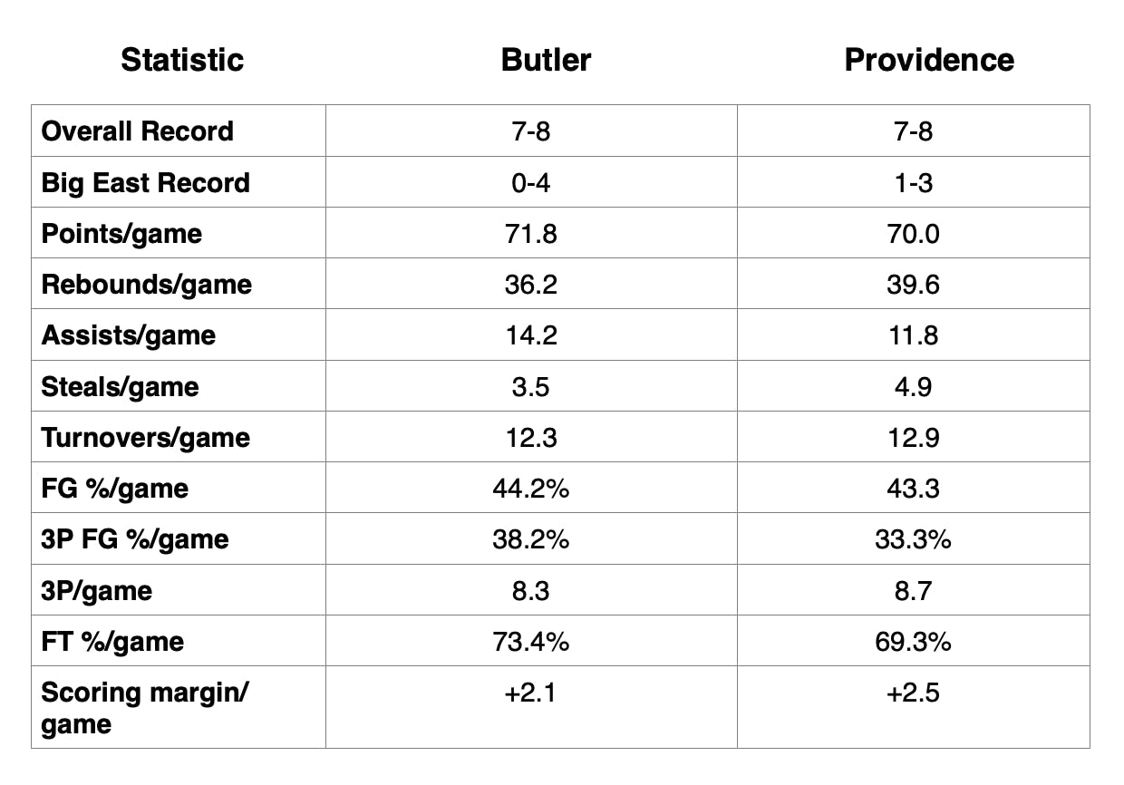 Butler’s losses, accounting for their Big East 0-4 record, have been against Marquette, UConn, Villanova, and St. John’s. The Bulldogs were competitive in all those games, losing them by an average margin of 7.5 points/game. The competitiveness of Butler so far in the Big East, the overall metrics of the two teams as seen below, and the desperation of Butler suggests that the Friars should expect a very close battle.
