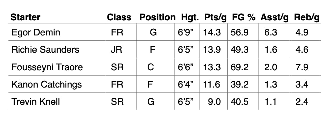 - They have an unusual lineup, featuring a 6’6” center in senior Fousseyni Traore and a 6’9” point guard in freshman phenom Egor Demin (a 5-star recruit from Russia of all places). I wonder who Coach English will have guarding Demin.