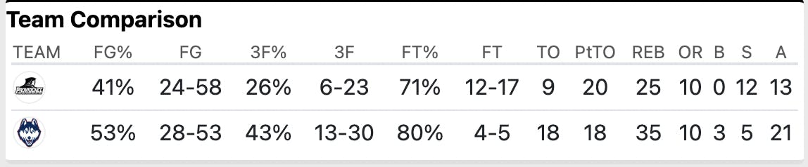 UConn beat PC in every statistical category.