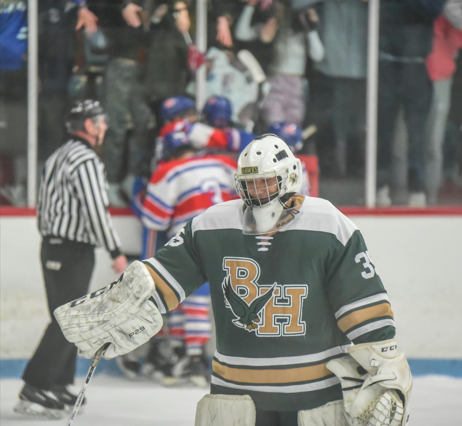 The Mount St. Charles Mounties beat the Bishop Hendricken Hawks 6-3 on Friday night at Adelard Arena at Mount St. Charles.