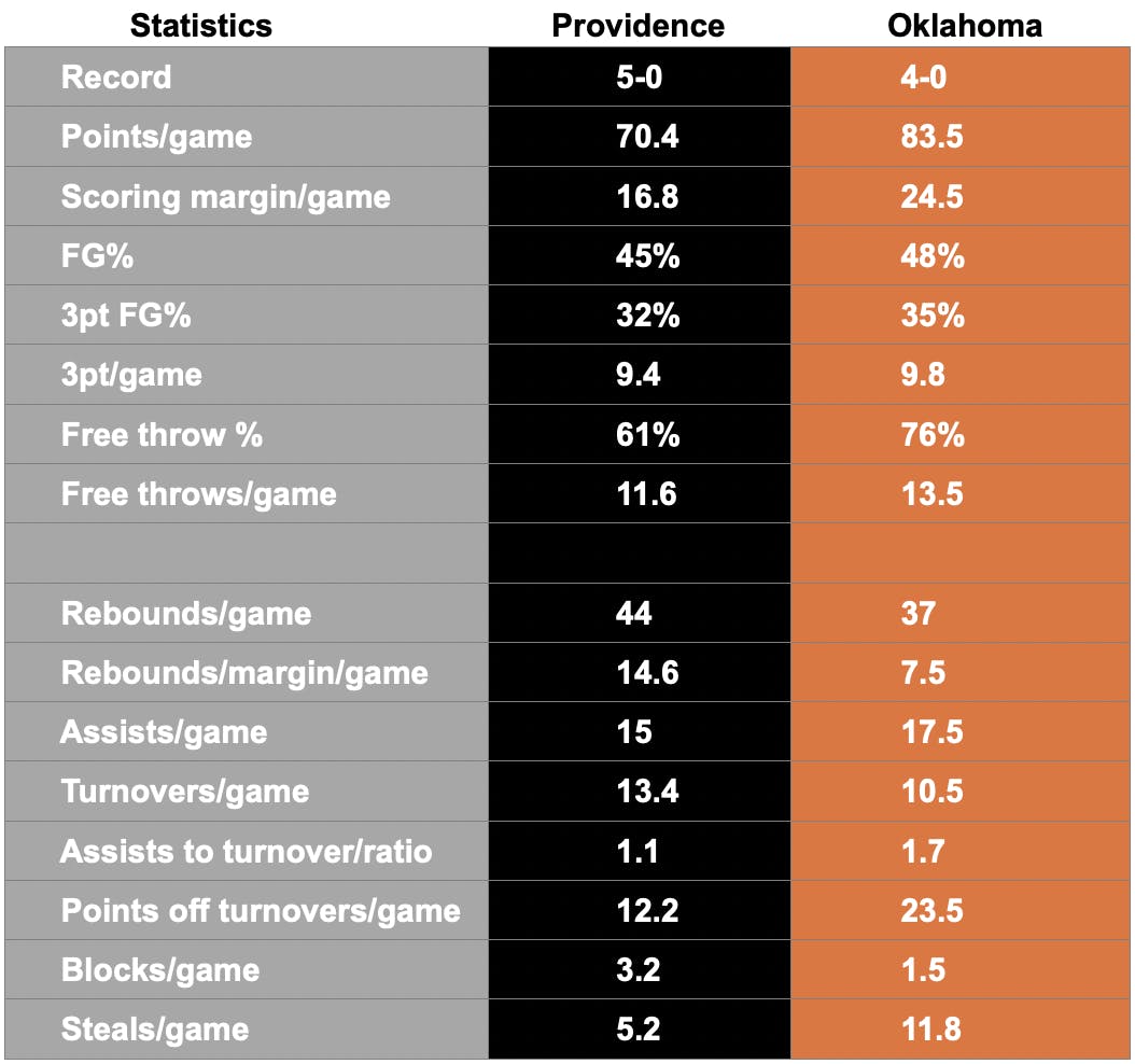 Also impressive is the difference in foul shooting. PC’s shooting at the charity stripe is unbelievably poor—61%. The Sooners have a respectable 76%. The Friars could lose this game at the foul line if they don’t improve their free throw shooting.