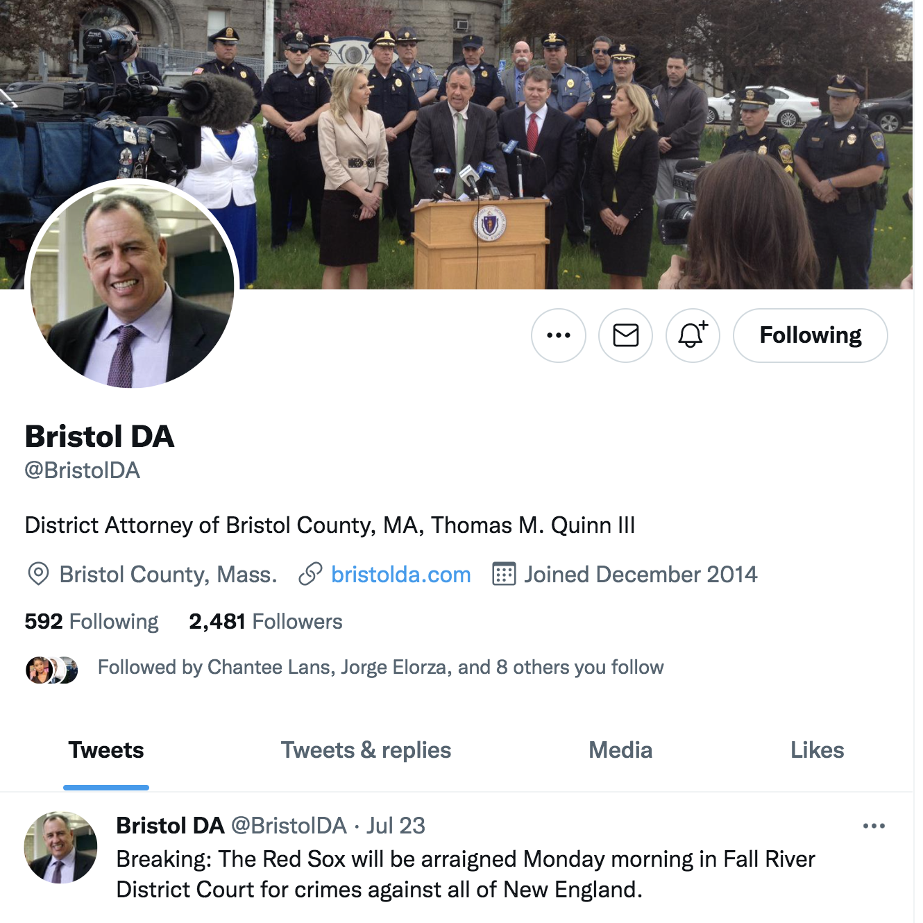 Red Sox to be “Arraigned” — For Crimes Against New England, Tweets MA District Attorney