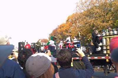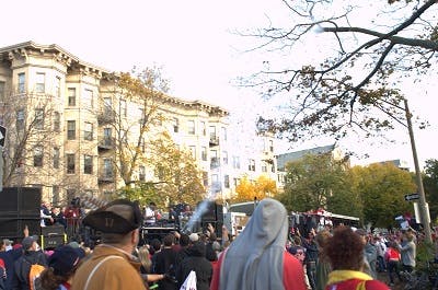 The last boat in line fires more confetti into the crowd. One of the colonial era Boston natives somehow managed to make an appearance (see left)