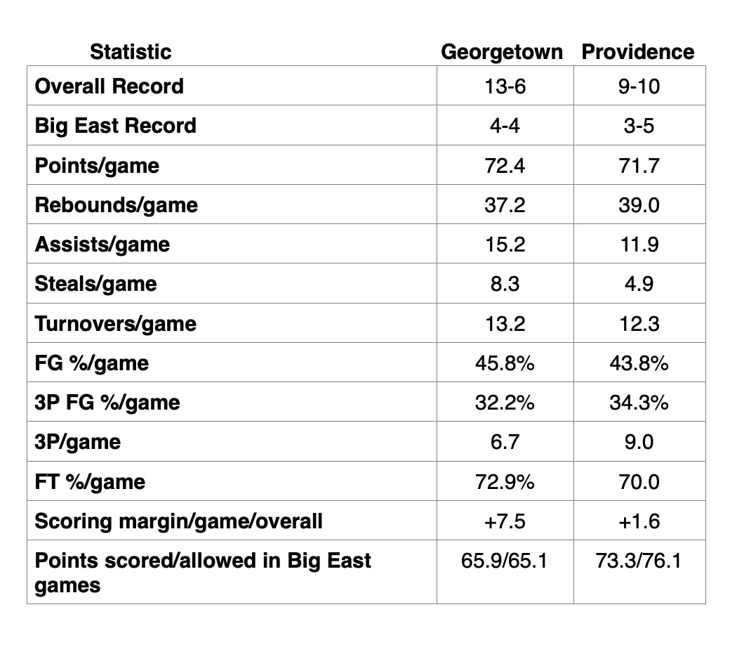 Neither team has a big-time stud scorer. The Friars' top scorers, if you don’t include Hopkins’ 3 games, are Jayden Pierre at 12.6 pts/game, Bensley Joseph at 12.3 pts/game, and Wes Cardet at 10.2 pts/game—all very modest numbers. And none of them are consistent scorers from one game to the next. The Hoyas have four scorers all with comparable modest numbers: forward Thomas Sorber at 14.2 pts/game, guard Micah Peavy at 13.9 pts/game, guard Jayden Epps at 13.3 pts/game, and guard Malik Mack at 13.3 pts/game.
