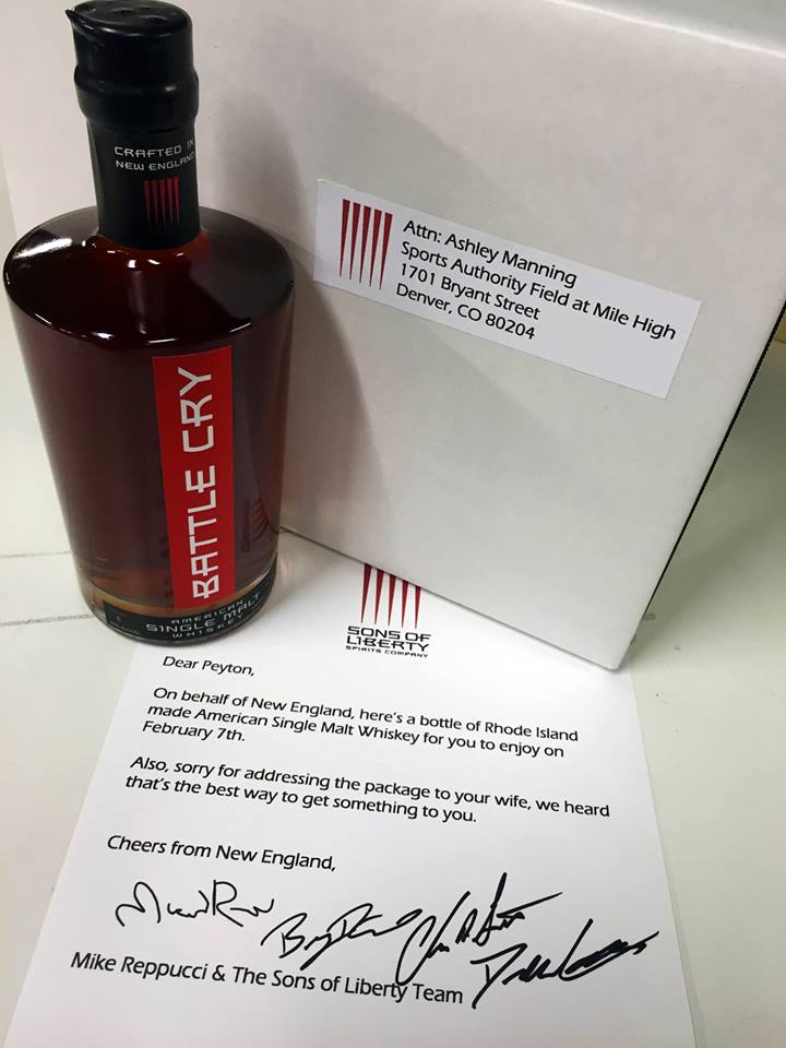 Sons of Liberty Spirits letter and bottle to Manning. Photo: Sons of Liberty Spirits Facebook pageRhode Island based Whiskey company, Sons of Liberty Spirits, is shipping it's product to Denver Broncos quarterback Peyton Manning, but believe previous attempts have failed.