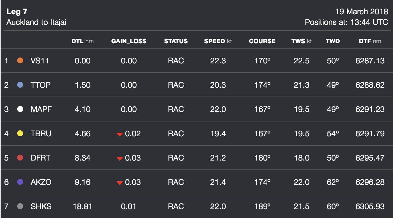 The fleet is approximately 24 hours into leg 7, which takes them from Auckland to Itajaí, Brazil.