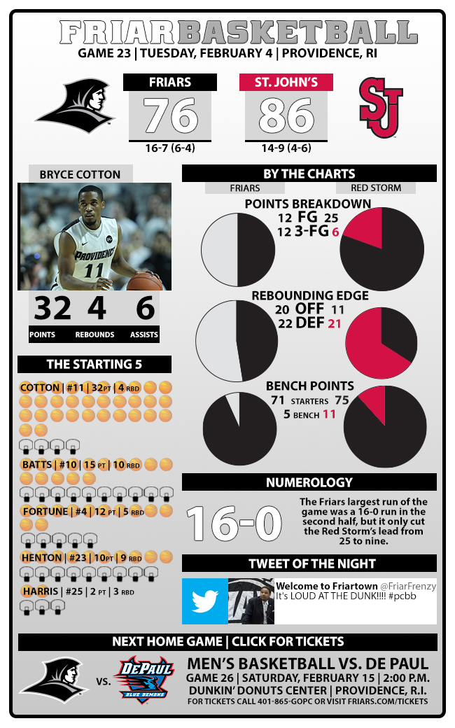 Providence drops to 16-7 on the season, 6-4 in league play, and earns a split of their two games against St. John’s for the season. The Red Storm has now won five of six since losing to PC January 16th, with the lone loss on a buzzer-beater at Creighton, and includes a 15-point home win last Saturday against Marquette…Cotton’s 32 points was just two shy of a career high, but was a Big East high, and he also had six assists in playing all 40 minutes for a 7th straight game…Batts finished with 15 points and 10 rebounds, his 6th double-double of the season and 14th of his career…Henton narrowly missed a double-double as well with 10 points and nine rebounds, and PC outrebounded SJU 42-32…Fortune finished with 12 points (4-of-5 on three’s) while Tyler Harris had a tough night (two points in 20 minutes, 1-of-8 from the floor)…PC had a season-high 12 made three-point field goals (in 28 attempts)…St. John’s was held to just 34% shooting in the second half, but still finished at 50% for the game – which should give an idea how well they played in the opening 20 minutes…Harrison led the way with 22 points, 11-of-12 from the line…Sampson finished with a season-high tying 21 points and Jordan had a career high 18 points with six assists…the Red Storm committed only five turnovers for the game, while they forced 15 Friar mistakes for 19 points, outscoring PC 19-4 off of turnovers over 40 minutes…they also punished the Friars 42-18 scoring in the paint…prior to the tip-off, USA Basketball named Ed Cooley as one of three coaches to lead the national U-18 team in the FIBA Americas Tournament this summer. Cooley and Sean Miller of Arizona will assist for former Friar and current Florida head coach Billy Donovan…PC will now head back to the road for two straight games, beginning with a first-ever visit to the Cintas Center at Xavier Saturday afternoon (2:45 pre-game on 103.7 FM and friars.com) and then a quick-turnaround for a Monday night encounter at Georgetown…