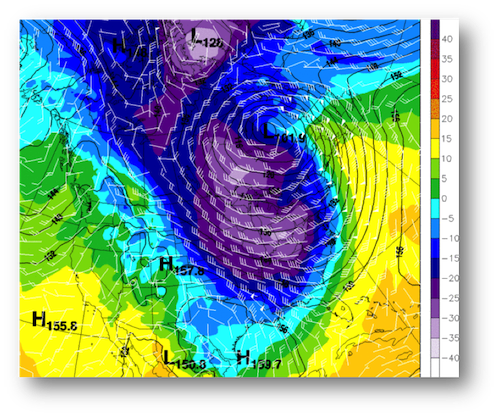 Map courtesy of the National Oceanic and Atmospheric AdministrationI guess if we have one thing to be grateful for, it is that the core of the cold air will not drive directly into the Northeast…the Midwest will be the recipients of the coldest of the cold, thanks to a piece of the polar vortex breaking off and descending into the country through the western Great Lakes. The temperatures at roughly 5,000 feet give forecasters their best indication of what surface temperatures will be like and if we look at what those temperatures will look like this evening, you can see that the Northeast will not be getting the worst of the cold...
