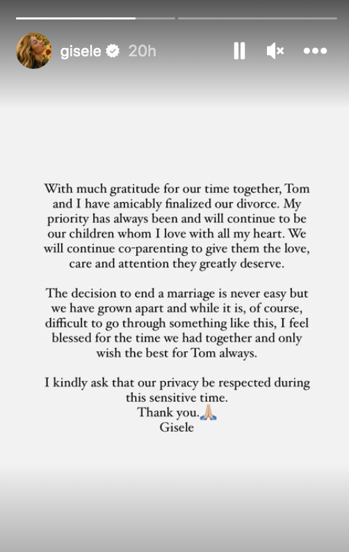 "Tom and I have amicably finalized our divorce," wrote Gisele.