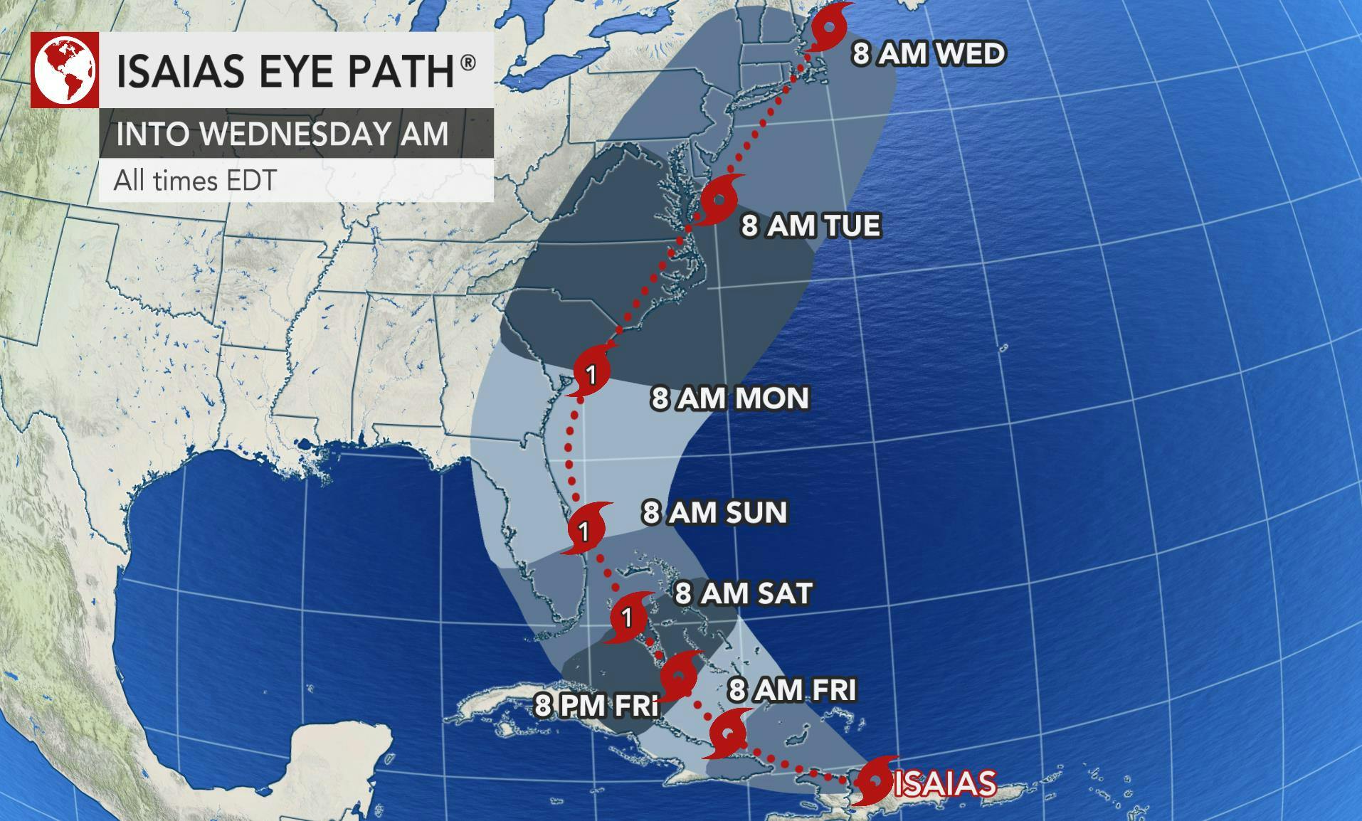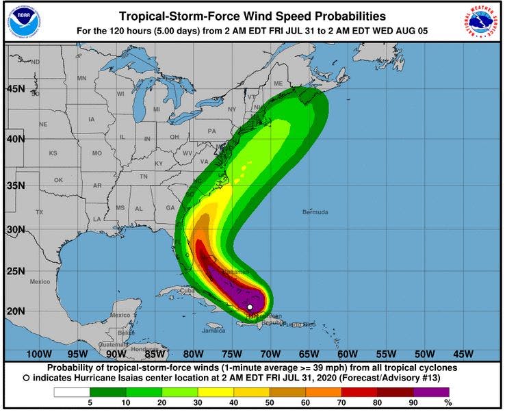 Here is what we know: Accuweather says, “Isaias ramped up to an 80-mph Category 1 hurricane during Thursday night, shortly after pulling away from Hispaniola and will now churn through the Bahamas, just north of Cuba, before making a run along the Eastern seaboard of the United States this weekend to early next week.