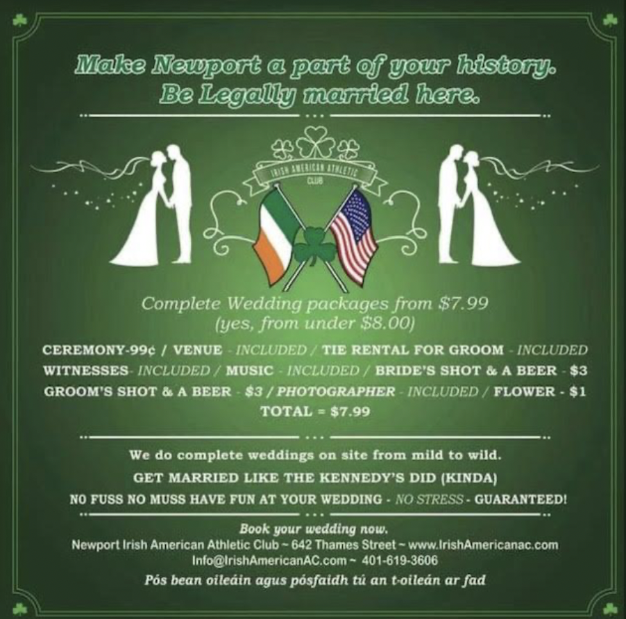 If your budget is slightly smaller, you can get legally married, with witnesses, music, a tie rental and a flower — and a shot and a beer for the bride and groom — for $7.99 at the Newport Irish American Athletic Club (IA).